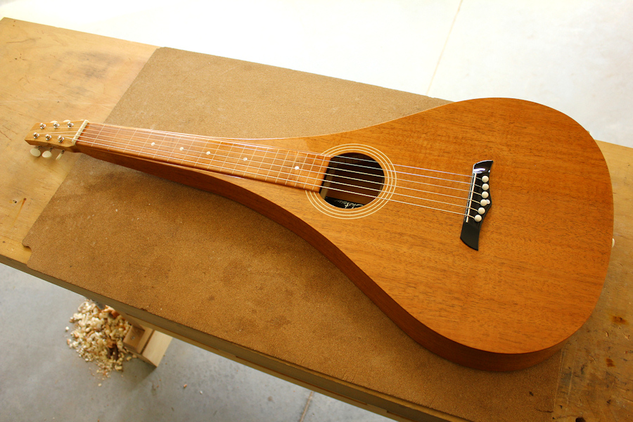 Le modèle de teardrop que je fabrique est basé d'après une originale teardrop de 1927 que j'ai eu la chance de restaurer. Comme mes autres modèles, le Koa est sélectionné selon plusieurs critères tel que le séchage du bois, la coupe, la résonnance, l'esthétique; utilisation comme à l'époque de colle de peau(hide glue). Même chose pour la finition ou une légère teinte à base de gomme laque est appliquée pour retrouver l'aspect des anciennes weissenborn, suivi de très fines couches de vernis afin de protéger et laisser vibrer la guitare au maximum.